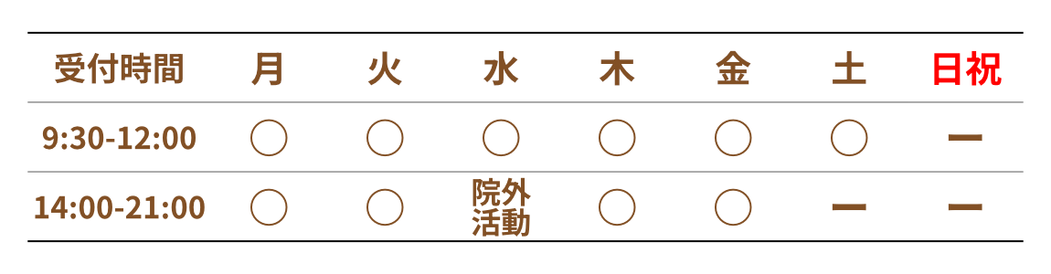 当院は水曜を除く平日は21時まで受付をしておりますので、お仕事帰りやお忙しい方でも予定が立てやすいとご好評を頂いております。