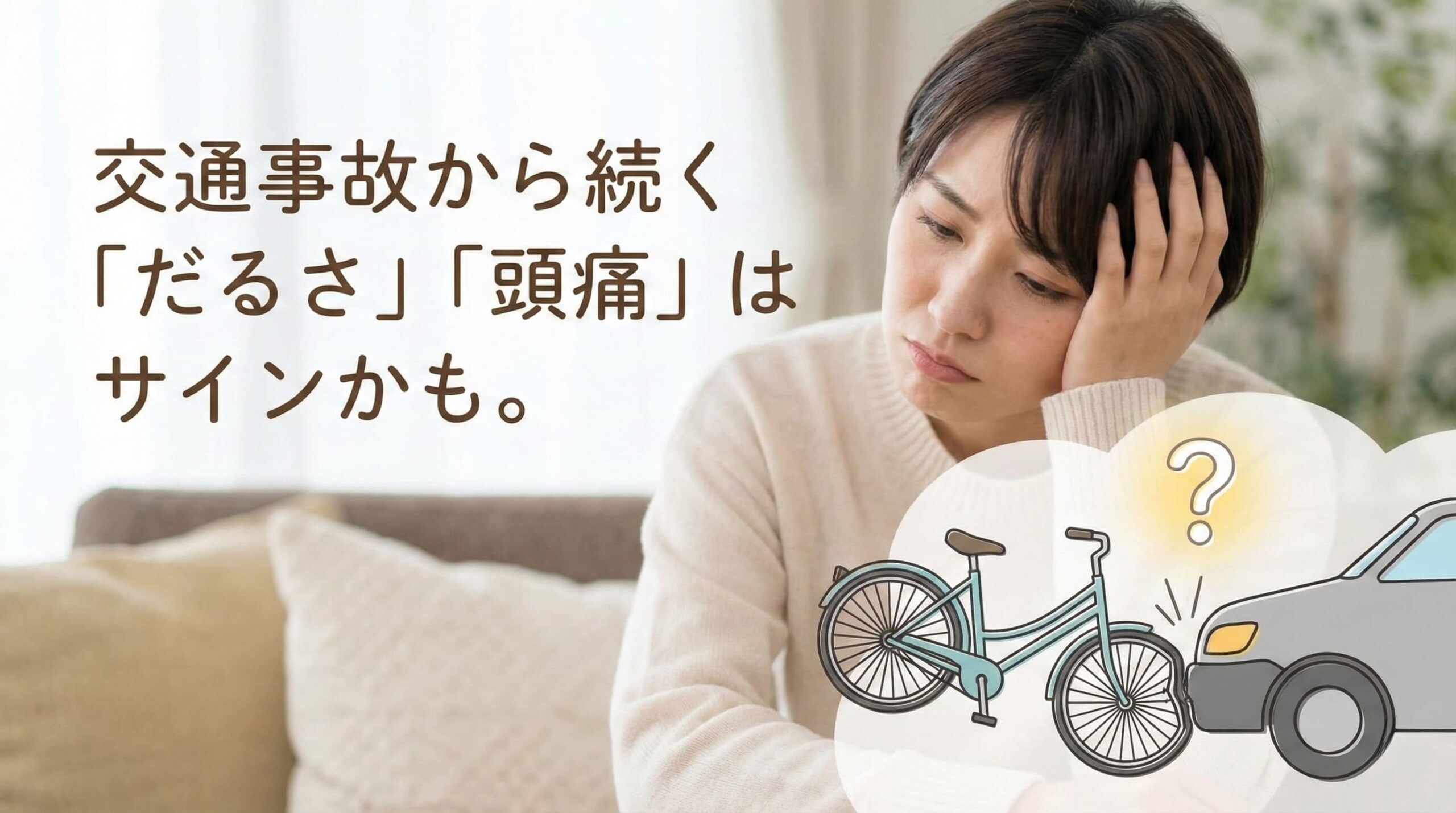 交通事故に遭われた直後、病院で「骨に異常はありません」と言われ、ひとまず安心したはずなのに…。数週間あるいは数ヶ月が経った頃、言葉にできない「体の重だるさ」や「慢性的な頭痛」「めまい」に悩まされてはいませんか? 「事故の