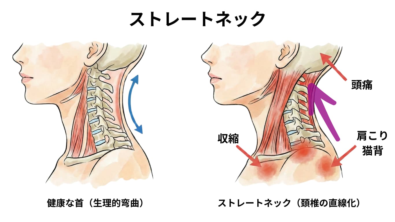 特にデスクワークの方は、モニターを見るために頭が前に出る「ストレートネック(スマホ首)」や、背中が丸まる「猫背」になっているケースが非常に多いです。